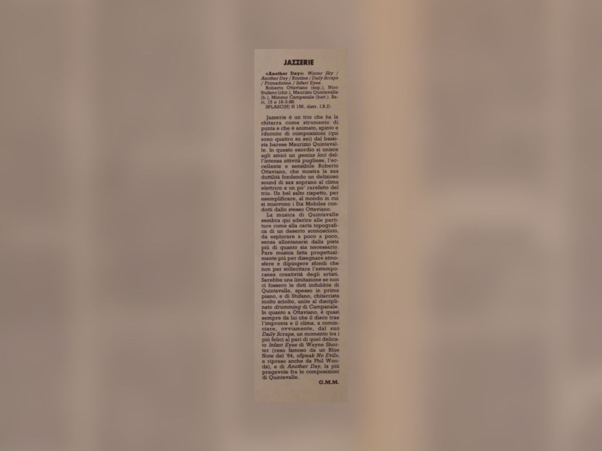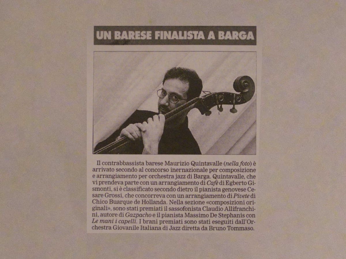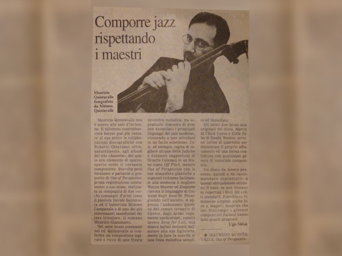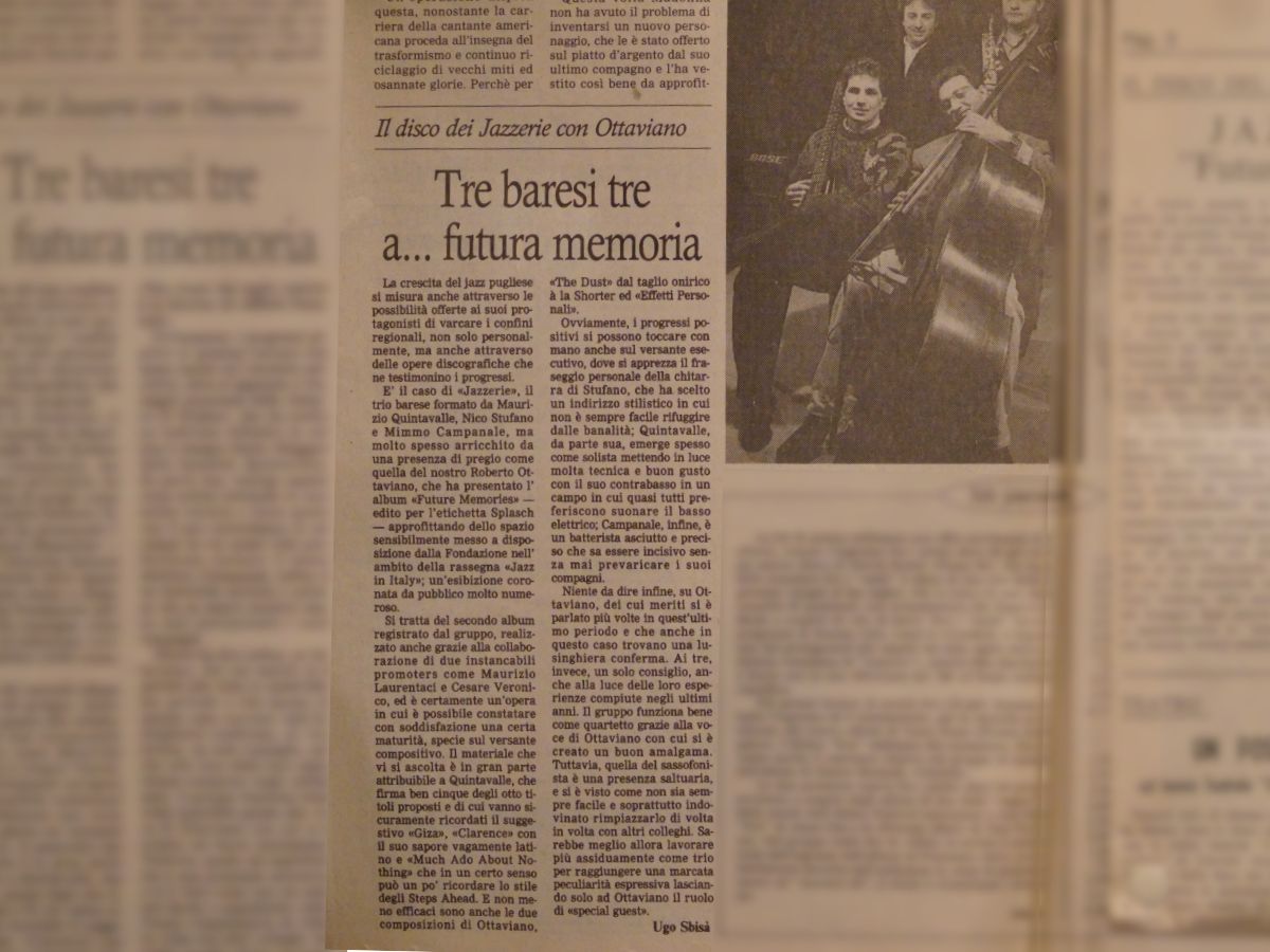 press Articoli Jazz Tre baresi tre a...futura memoria Data di pubblicazione:Martedì 29 Maggio 1990 Testata:La Gazzetta del Mezzogiorno Jazzerie"Future Memories" Data di pubblicazione:Marzo 1991 Testata: La Sila (n.3) Comporre Jazzrispettando i maestri Data di pubblicazione:Martedì 8 Novembre 1994 Testata:La Gazzetta del Mezzogiorno Uomo aquattro corde Data di pubblicazione:Giovedì 5 Dicembre 1996 Testata:La Gazzetta del Mezzogiorno Un baresefinalista a Barga Data di pubblicazione:1996 Testata:La Gazzetta del Mezzogiorno Jazz targato Bariin un cd della Sony Data di pubblicazione:Domenica 29 settembre 2002 Testata:La Gazzetta del Mezzogiorno Cartoon a pennelloper il Jazz Data di pubblicazione:Martedì 21 Dicembre 2004 Testata: La Gazzetta del Mezzogiorno Musica e cultura persedurre i turisti Data di pubblicazione:Sabato 23 Febbraio 2008 Testata:La Gazzetta del Mezzogiorno Intervista aMaurizio Quintavalle Data di pubblicazione:Settembre/Ottobre 2008 Testata:JAZZIT n°48 Non conosce routineil Jazz pugliese Data di pubblicazione:Sabato 25 Ottobre 2008 Testata:Il Corriere del Mezzogiorno RecensioneAnother Day Data di pubblicazione:Ottobre 1989 Testata:Cadence, pag.85 (CAN) RecensioneFuture Memories Data di pubblicazione:Luglio 1990 Testata:Musica Jazz RecensioneAnother Day Data di pubblicazione:Agosto 1990 Testata:Musica Jazz RecensionePowell to the People Data di pubblicazione:Maggio 2018 Testata:Musica Jazz n°810 RecensioneAcoustic Weather Data di pubblicazione:Agosto 2019 Testata:Musica Jazz n°825