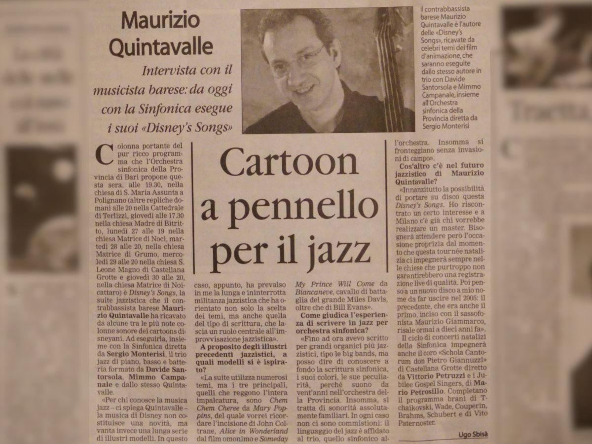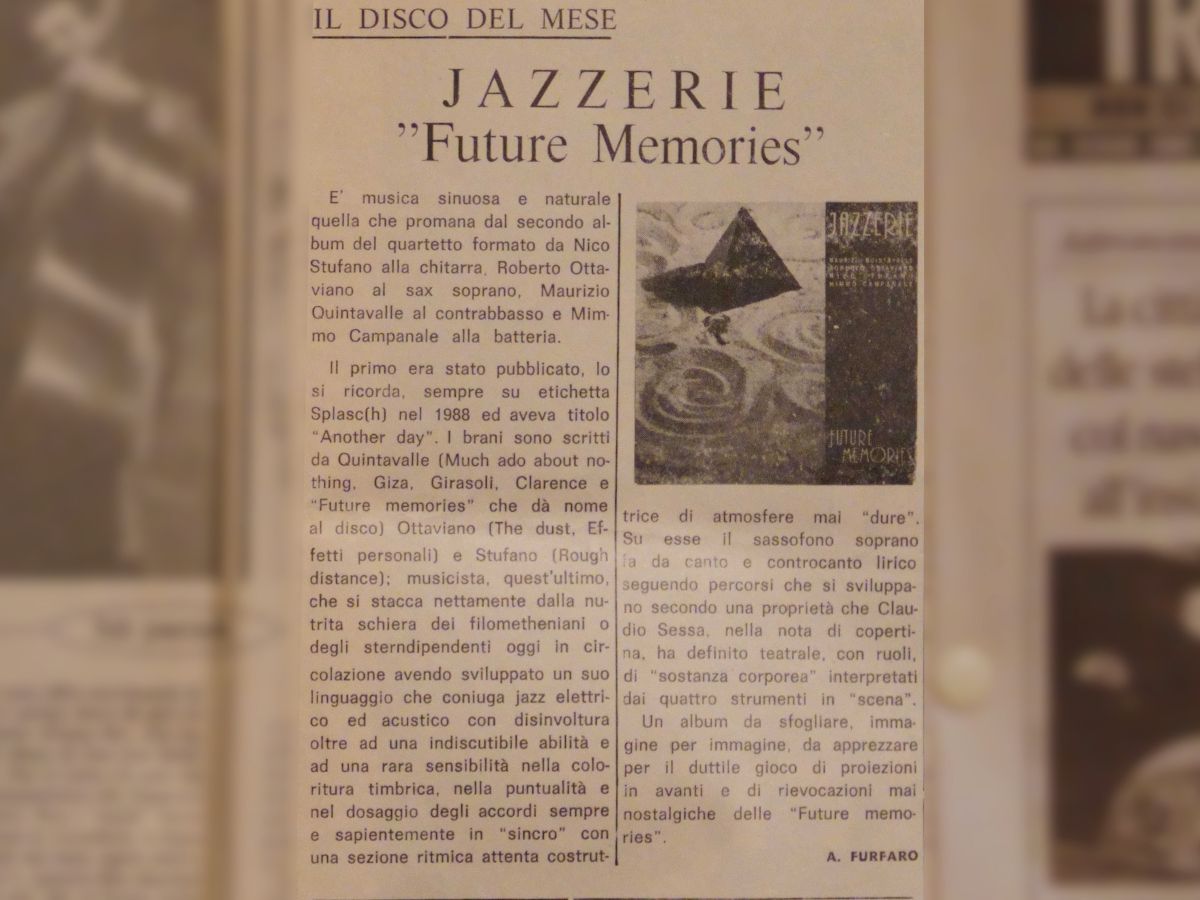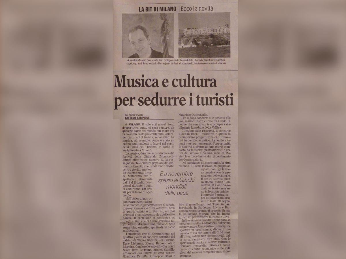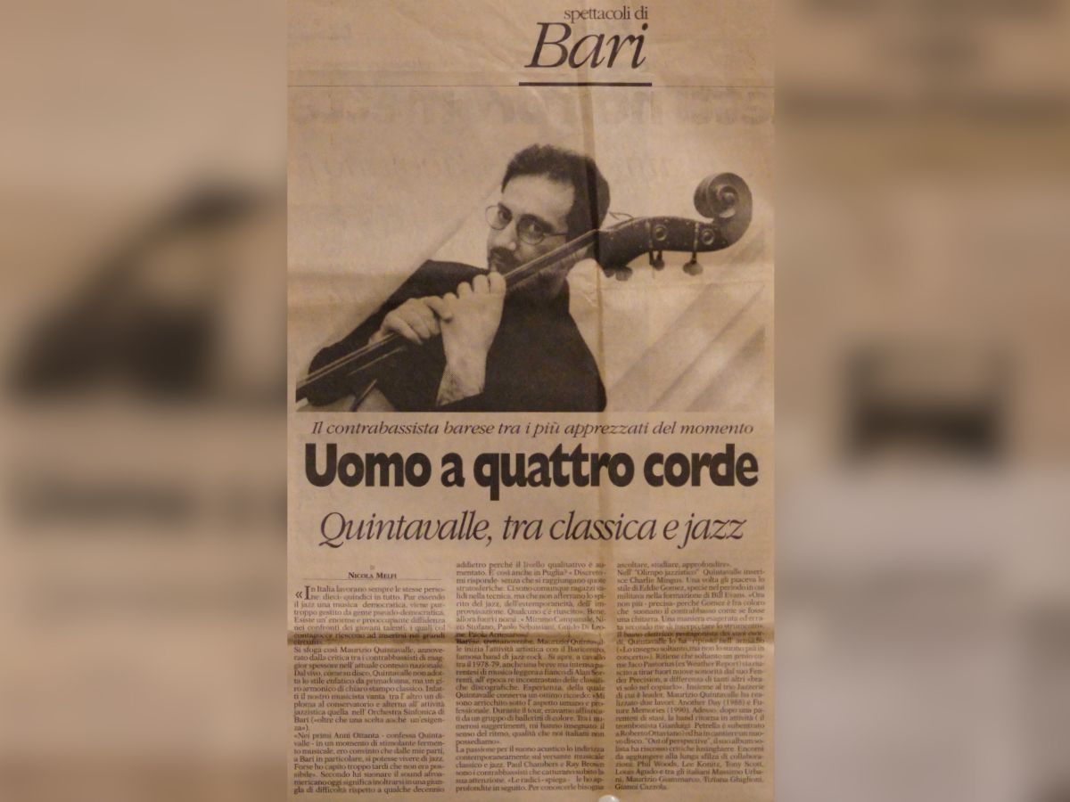 press Articoli Jazz Tre baresi tre a...futura memoria Data di pubblicazione:Martedì 29 Maggio 1990 Testata:La Gazzetta del Mezzogiorno Jazzerie"Future Memories" Data di pubblicazione:Marzo 1991 Testata: La Sila (n.3) Comporre Jazzrispettando i maestri Data di pubblicazione:Martedì 8 Novembre 1994 Testata:La Gazzetta del Mezzogiorno Uomo aquattro corde Data di pubblicazione:Giovedì 5 Dicembre 1996 Testata:La Gazzetta del Mezzogiorno Un baresefinalista a Barga Data di pubblicazione:1996 Testata:La Gazzetta del Mezzogiorno Jazz targato Bariin un cd della Sony Data di pubblicazione:Domenica 29 settembre 2002 Testata:La Gazzetta del Mezzogiorno Cartoon a pennelloper il Jazz Data di pubblicazione:Martedì 21 Dicembre 2004 Testata: La Gazzetta del Mezzogiorno Musica e cultura persedurre i turisti Data di pubblicazione:Sabato 23 Febbraio 2008 Testata:La Gazzetta del Mezzogiorno Intervista aMaurizio Quintavalle Data di pubblicazione:Settembre/Ottobre 2008 Testata:JAZZIT n°48 Non conosce routineil Jazz pugliese Data di pubblicazione:Sabato 25 Ottobre 2008 Testata:Il Corriere del Mezzogiorno RecensioneAnother Day Data di pubblicazione:Ottobre 1989 Testata:Cadence, pag.85 (CAN) RecensioneFuture Memories Data di pubblicazione:Luglio 1990 Testata:Musica Jazz RecensioneAnother Day Data di pubblicazione:Agosto 1990 Testata:Musica Jazz RecensionePowell to the People Data di pubblicazione:Maggio 2018 Testata:Musica Jazz n°810 RecensioneAcoustic Weather Data di pubblicazione:Agosto 2019 Testata:Musica Jazz n°825